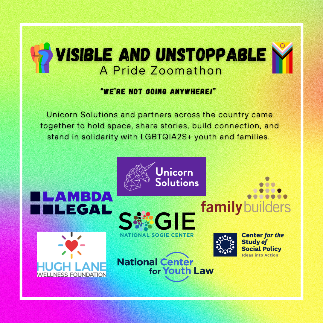 Great work is done in collaboration with community, and this event wouldn’t be possible with these national organization partners, as well as more behind the scenes, for the Visible and Unstoppable Pride Zoomathon and Campaign! Click each logo to visit their websites and learn more. Want to join us and raise your logo with ours as a visible and unstoppable partner in support of LGBTQIA2S+ Youth and Families? Email us at vuinfo@unicornsolutions.org!
